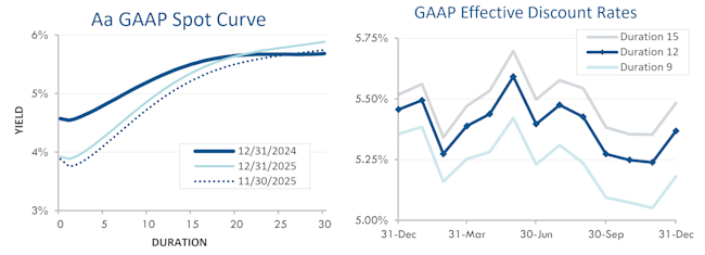 Pension liabilities (for funding, accounting, and de-risking purposes) are driven by market interest rates. The first graph below compares our Aa GAAP spot yield curve at December 31, 2024 and December 31, 2025 (along with the movement in the curve last month). The second graph below shows our estimate of movements in effective GAAP discount rates for pension obligations of various duration during 2025: