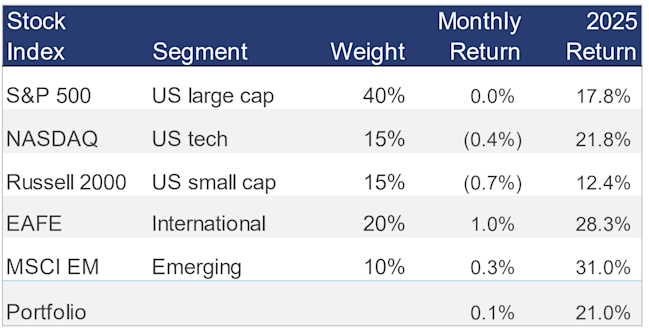 Stocks were mixed in December; a diversified stock portfolio earned a thumping 21% during 2025, led by overseas markets: