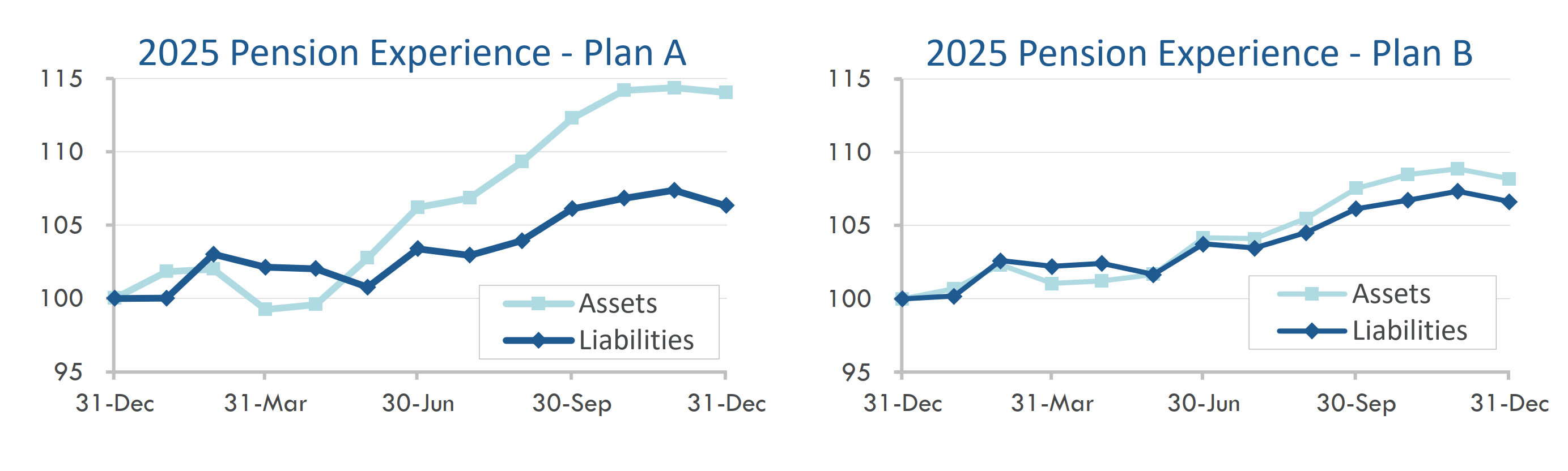 The end of 2025 marks seven consecutive years of improved pension finances, easily the best run during the first quarter of the 21st century. The graphs below show the movement of assets and liabilities for our two model plans during the year: