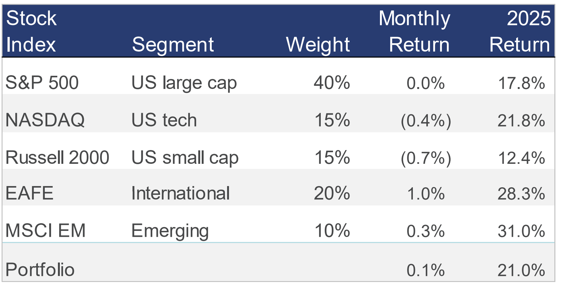 Stocks were mixed in December; a diversified stock portfolio earned a thumping 21% during 2025, led by overseas markets: