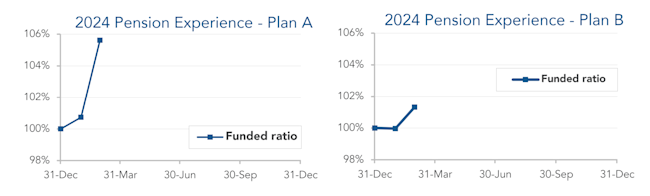 Corporate bond yields rose 0.25% in February and are up 0.35% so far this year. As a result, pension liabilities have declined 2%-4% through the first two months of 2024, with long duration plans seeing the largest drops.