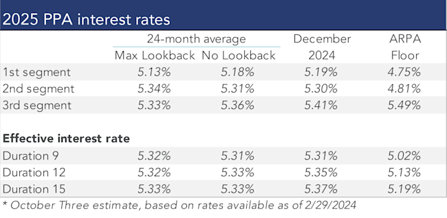 The table below summarizes rates that calendar-year plan sponsors are required to use for IRS funding purposes for 2024, along with estimates for 2025. Pre-relief, both 24-month averages and December ‘spot’ rates, which are still required for some calculations, are also included.