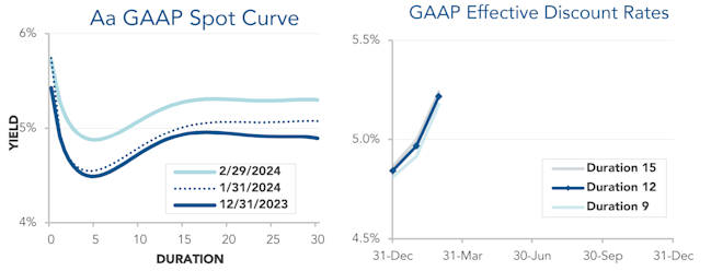 Pension liabilities (for funding, accounting, and de-risking purposes) are driven by market interest rates. The first graph below compares our Aa GAAP spot yield curve at December 31, 2023 and February 29, 2024 (along with the movement in the curve last month). The second graph below shows our estimate of movements in effective GAAP discount rates for pension obligations of various duration during 2024: