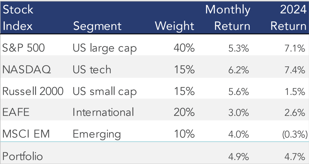 Stocks enjoyed strong growth across the board in February. A diversified stock portfolio ended the month up almost 5% so far this year: