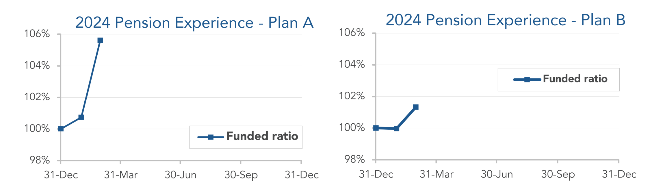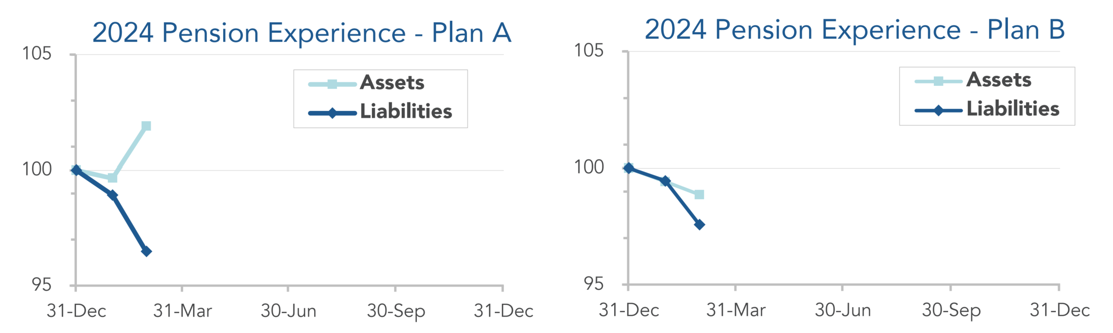 Corporate bond yields rose 0.25% in February and are up 0.35% so far this year. As a result, pension liabilities have declined 2%-4% through the first two months of 2024, with long duration plans seeing the largest drops.
