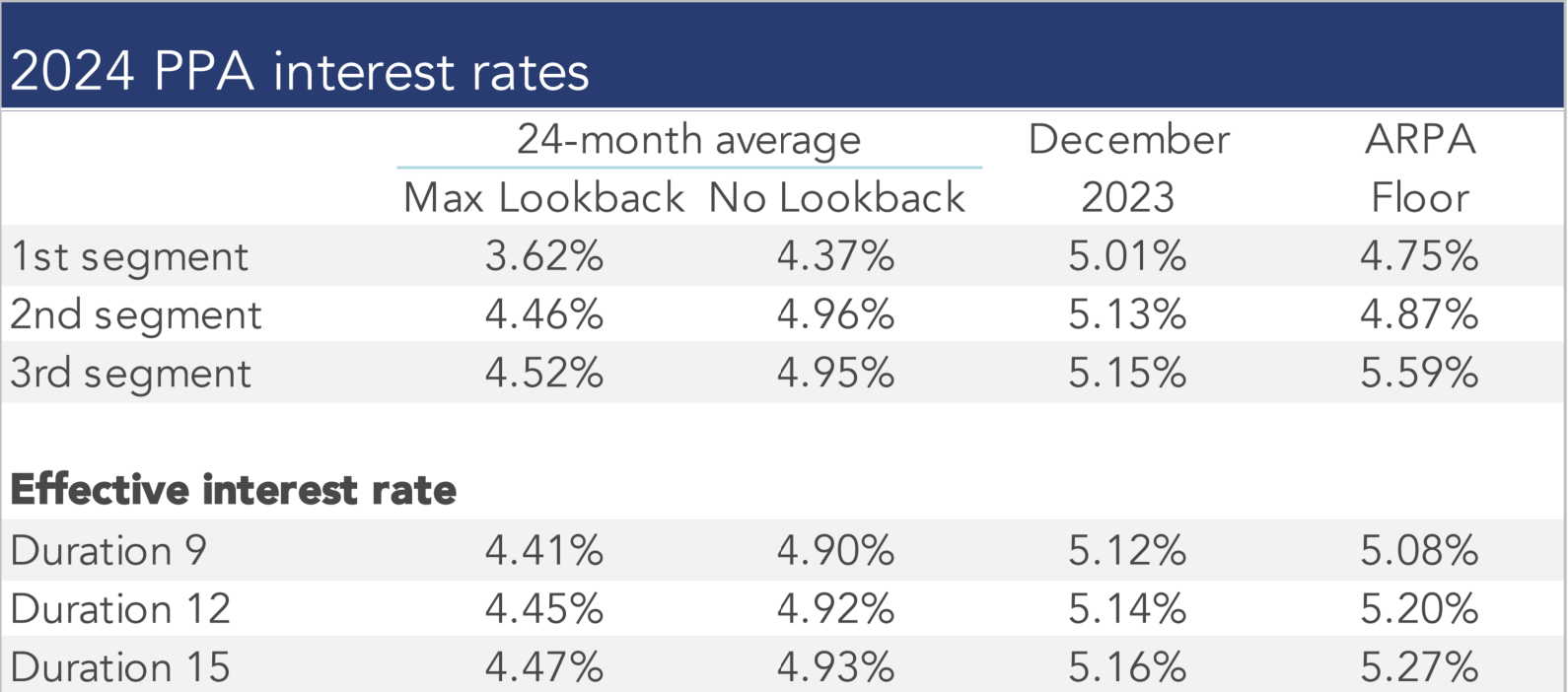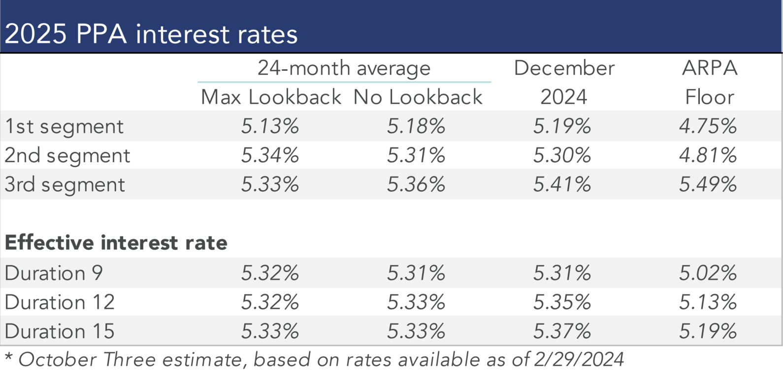 The table below summarizes rates that calendar-year plan sponsors are required to use for IRS funding purposes for 2024, along with estimates for 2025. Pre-relief, both 24-month averages and December ‘spot’ rates, which are still required for some calculations, are also included.