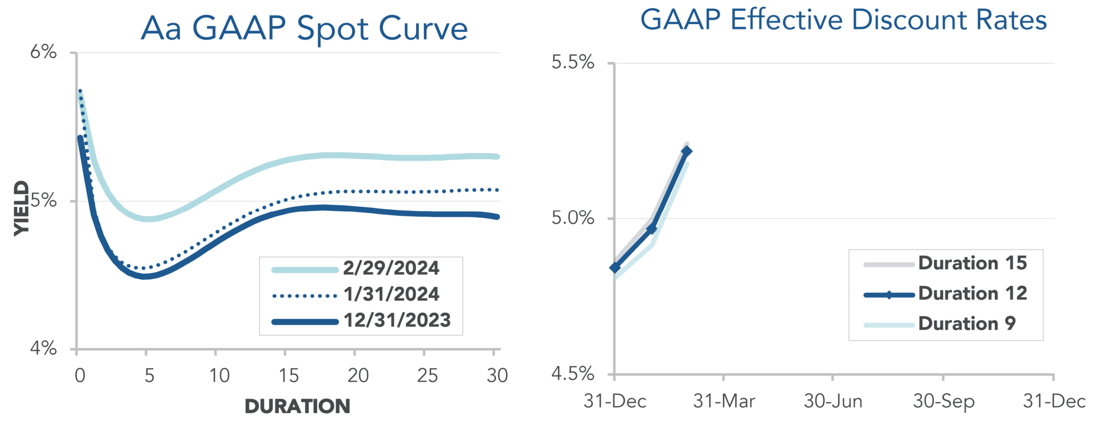 Pension liabilities (for funding, accounting, and de-risking purposes) are driven by market interest rates. The first graph below compares our Aa GAAP spot yield curve at December 31, 2023 and February 29, 2024 (along with the movement in the curve last month). The second graph below shows our estimate of movements in effective GAAP discount rates for pension obligations of various duration during 2024:
