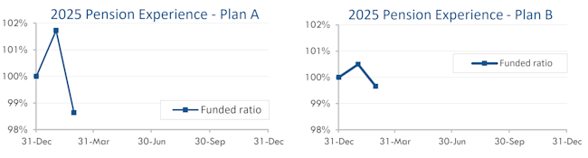 In February, pension finances suffered their worst monthly loss since 2022, due to the usual culprits, lower stocks plus lower interest rates. Both model plans we track[1] lost ground last month: traditional Plan A lost 3%, ending the month down more than 1% for the year, while the more conservative Plan B lost 1% and is down a fraction of 1% through the first two months of 2025: