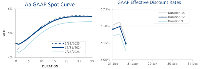 Pension liabilities (for funding, accounting, and de-risking purposes) are driven by market interest rates. The first graph below compares our Aa GAAP spot yield curve at December 31, 2024 and February 28, 2025 (along with the movement in the curve last month). The second graph below shows our estimate of movements in effective GAAP discount rates for pension obligations of various duration during 2025: