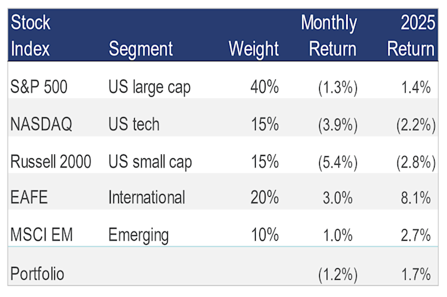 US stocks fell last month, producing a 1% loss in our diversified portfolio, which remains up more than 1% for the year on the strength of overseas markets.