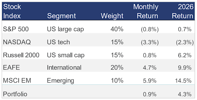 US stocks were mixed last month. Through February, a diversified portfolio is up 4% this year, led (as in 2025) by overseas markets.