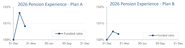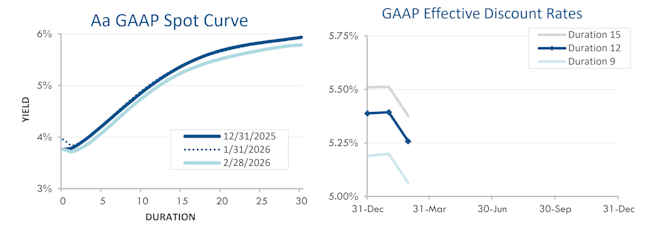 Corporate bond yields declined 0.15% in February after a flat January. As a result, pension liabilities have grown 2%-3% through the first two months of 2026, with long duration plans seeing the largest increases.