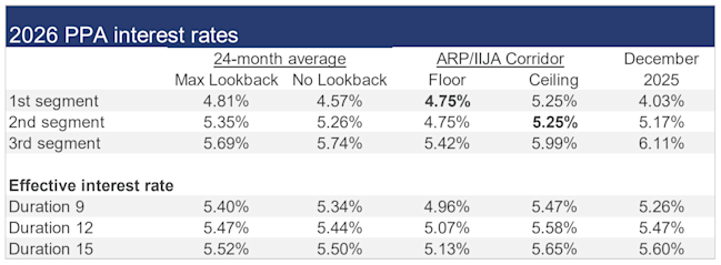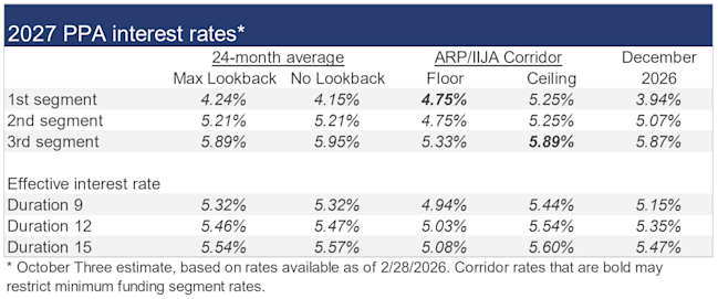 The table below summarizes rates that calendar-year plan sponsors are required to use for IRS funding purposes for 2026, along with estimates for 2027, including the rate “corridor” that applies to the 24-month average rates under funding relief for each segment.