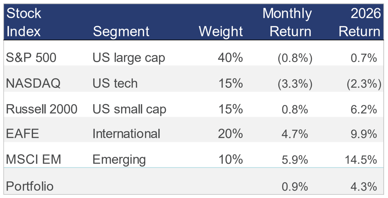Overall, our traditional 60/40 portfolio ended the month up 3% so far this year, while the conservative 20/80 portfolio is now up more than 2% through the first two months of 2026.