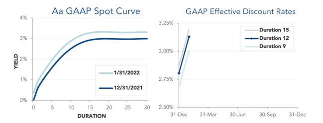 Pension liabilities (for funding, accounting, and de-risking purposes) are driven by market interest rates. The first graph below compares our Aa GAAP spot yield curve at December 31, 2021 and January 31, 2022. The second graph below shows our estimate of movements in effective GAAP discount rates for pension obligations of various duration during January: