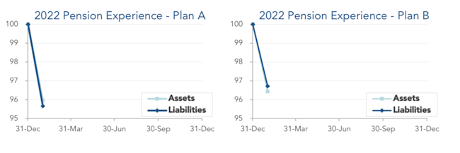 January was a mixed month for pensions, as higher interest rates and lower stock markets pushed pension assets and liabilities down last month. Both model plans we track were close to even on the month, with Plan A improving less than 1% while the more conservative Plan B lost a similar amount: