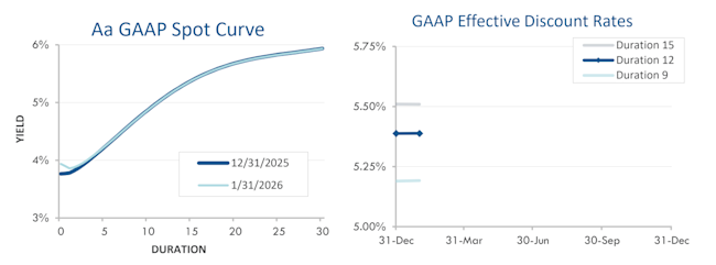 Pension liabilities (for funding, accounting, and de-risking purposes) are driven by market interest rates. The first graph below compares our Aa GAAP spot yield curve at December 31, 2025 and January 31, 2026. The second graph below shows our estimate of movements in effective GAAP discount rates for pension obligations of various duration during 2026: