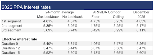 The table below summarizes rates that calendar-year plan sponsors are required to use for IRS funding purposes for 2026, along with estimates for 2027, including the rate “corridor” that applies to the 24-month average rates under funding relief for each segment.