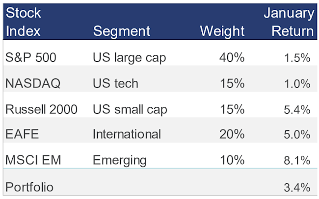 Stocks enjoyed gains in January, led by small cap and overseas markets; a diversified stock portfolio earned more than 3% last month: