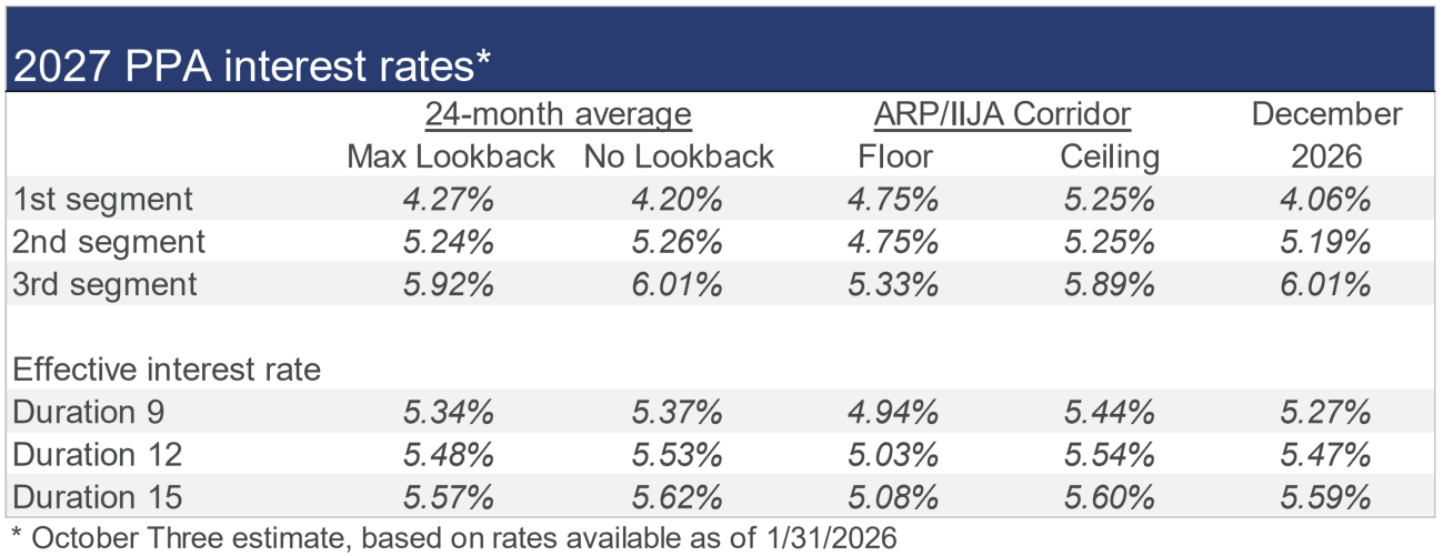 The table below summarizes rates that calendar-year plan sponsors are required to use for IRS funding purposes for 2026, along with estimates for 2027, including the rate “corridor” that applies to the 24-month average rates under funding relief for each segment.