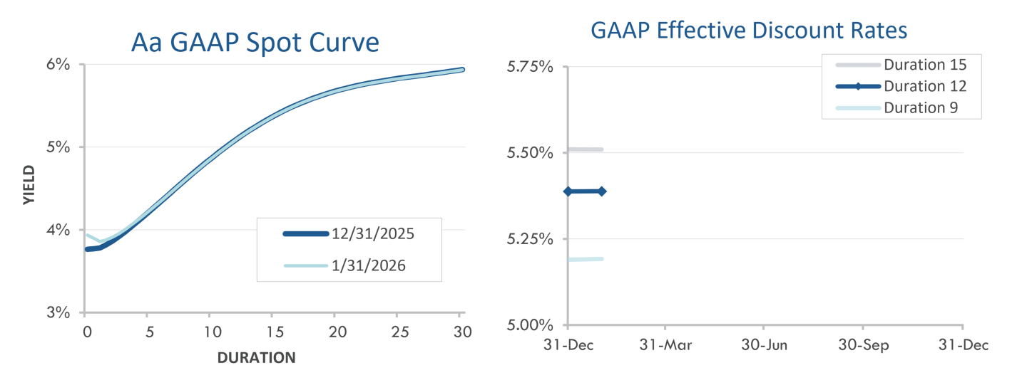 Pension liabilities (for funding, accounting, and de-risking purposes) are driven by market interest rates. The first graph below compares our Aa GAAP spot yield curve at December 31, 2025 and January 31, 2026. The second graph below shows our estimate of movements in effective GAAP discount rates for pension obligations of various duration during 2026: