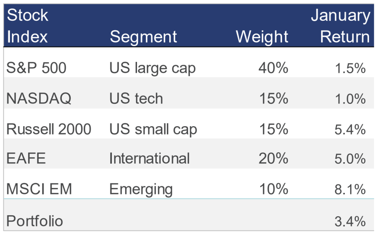 Stocks enjoyed gains in January, led by small cap and overseas markets; a diversified stock portfolio earned more than 3% last month: