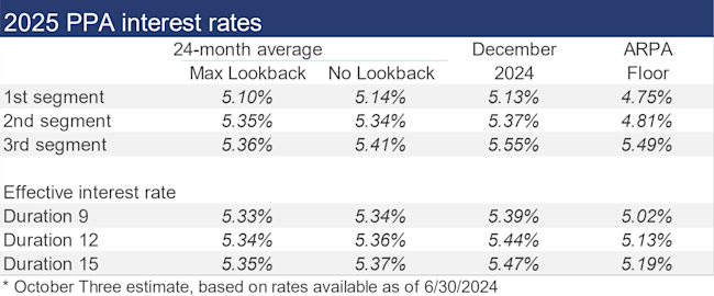 The table below summarizes rates that calendar-year plan sponsors are required to use for IRS funding purposes for 2024, along with estimates for 2025. Pre-relief, both 24-month averages and December ‘spot’ rates, are also included.
