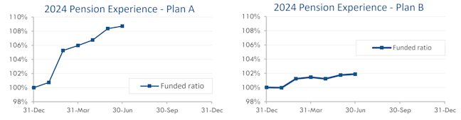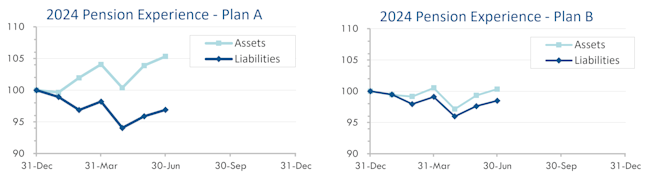 Pension finances ended June on a positive note, capping an excellent six month start to 2024. Both model plans we track[1] enjoyed positive experience again in June, as higher stock markets more than offset the impact of lower interest rates. Plan A improved a fraction of 1% last month, ending June up more than 8% this year, while Plan B also gained a fraction of 1% in June and is now up 2% through the first half of 2024: