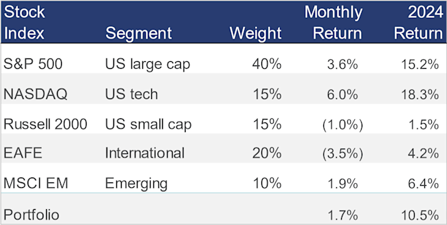 Stocks were mixed during June. A diversified stock portfolio gained almost 2% last month and is now up more than 10% for the year through June, with US large cap and tech stocks leading the way: