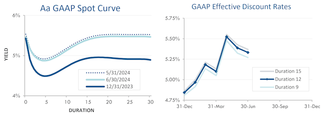 Pension liabilities (for funding, accounting, and de-risking purposes) are driven by market interest rates. The first graph below compares our Aa GAAP spot yield curve at December 31, 2023 and June 30, 2024 (along with the movement in the curve last month). The second graph below shows our estimate of movements in effective GAAP discount rates for pension obligations of various duration during 2024: