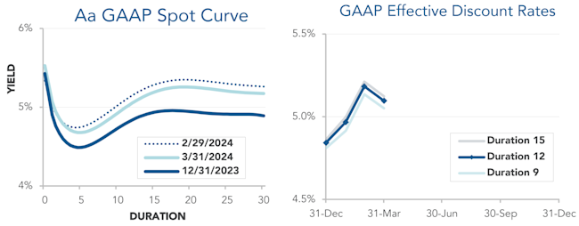 Pension liabilities (for funding, accounting, and de-risking purposes) are driven by market interest rates. The first graph below compares our Aa GAAP spot yield curve at December 31, 2023 and March 31, 2024 (along with the movement in the curve last month). The second graph below shows our estimate of movements in effective GAAP discount rates for pension obligations of various duration during 2024: