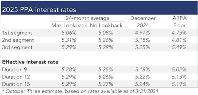 Sustained higher interest rates since late 2022 have (for now) effectively ended pension funding relief that has been in place since 2012. Underfunded plans are likely to see sharp increases in required contributions in the next year or two.
