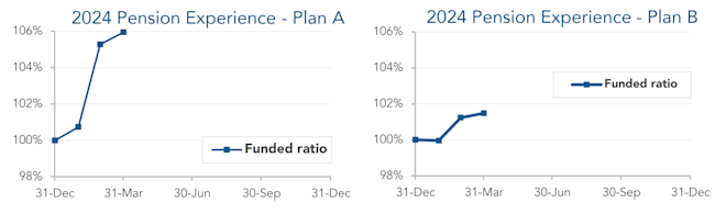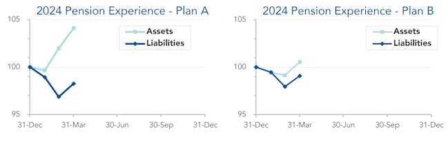 Interest rates hit 5% in the fall of 2022 and have remained near or above that level since. Meanwhile, stock markets have produced strong returns, translating to good news for pension sponsors. The graphs below show the movement of assets and liabilities during the first quarter of 2024: