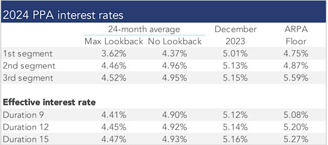 The table below summarizes rates that calendar-year plan sponsors are required to use for IRS funding purposes for 2024, along with estimates for 2025. Pre-relief, both 24-month averages and December ‘spot’ rates, which are still required for some calculations, are also included.