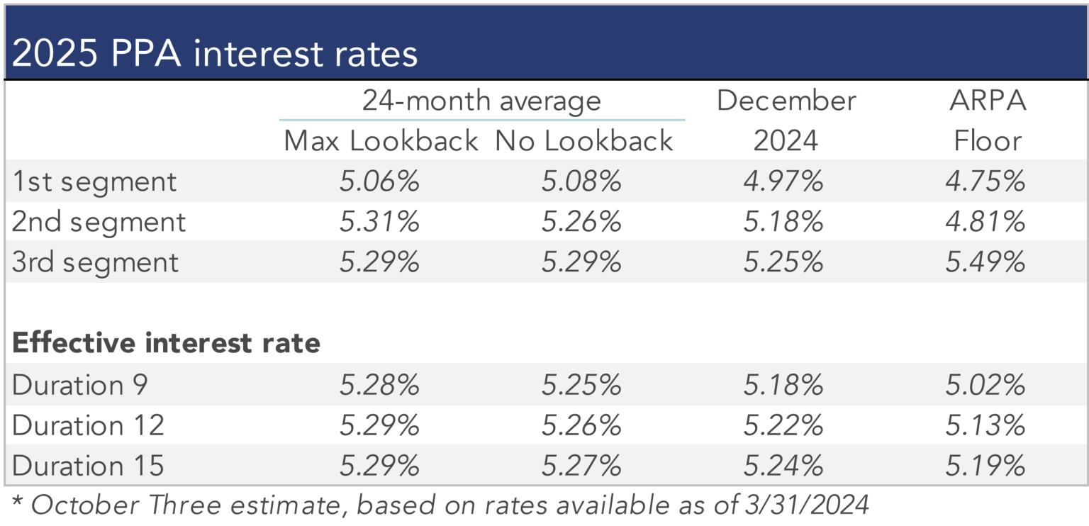 The table below summarizes rates that calendar-year plan sponsors are required to use for IRS funding purposes for 2024, along with estimates for 2025. Pre-relief, both 24-month averages and December ‘spot’ rates, which are still required for some calculations, are also included.