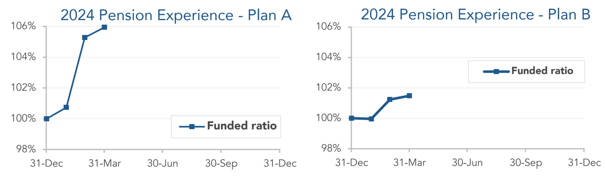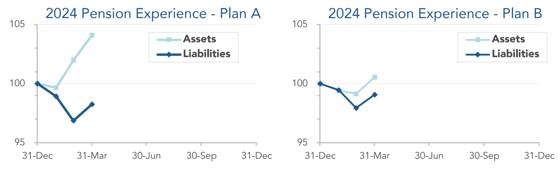 Interest rates hit 5% in the fall of 2022 and have remained near or above that level since. Meanwhile, stock markets have produced strong returns, translating to good news for pension sponsors. The graphs below show the movement of assets and liabilities during the first quarter of 2024: