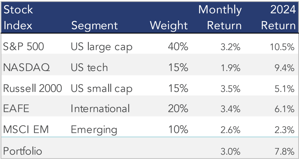 Stocks were up across the board again in March. A diversified stock portfolio added 3% last month, ending the first quarter up almost 8%:
