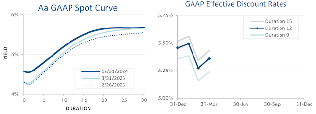 Pension liabilities (for funding, accounting, and de-risking purposes) are driven by market interest rates. The first graph below compares our Aa GAAP spot yield curve at December 31, 2024 and March 31, 2025 (along with the movement in the curve last month). The second graph below shows our estimate of movements in effective GAAP discount rates for pension obligations of various duration during 2025: