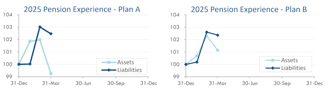 Pension sponsors suffered from lower US stock markets in the first quarter of the year. The graphs below show the movement of assets and liabilities during the first three months of 2025: