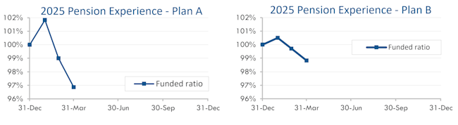 Corporate bond yields rose 0.1% in March. As a result, pension liabilities declined 1% last month but remain up 2%-3% through the first quarter of 2025.