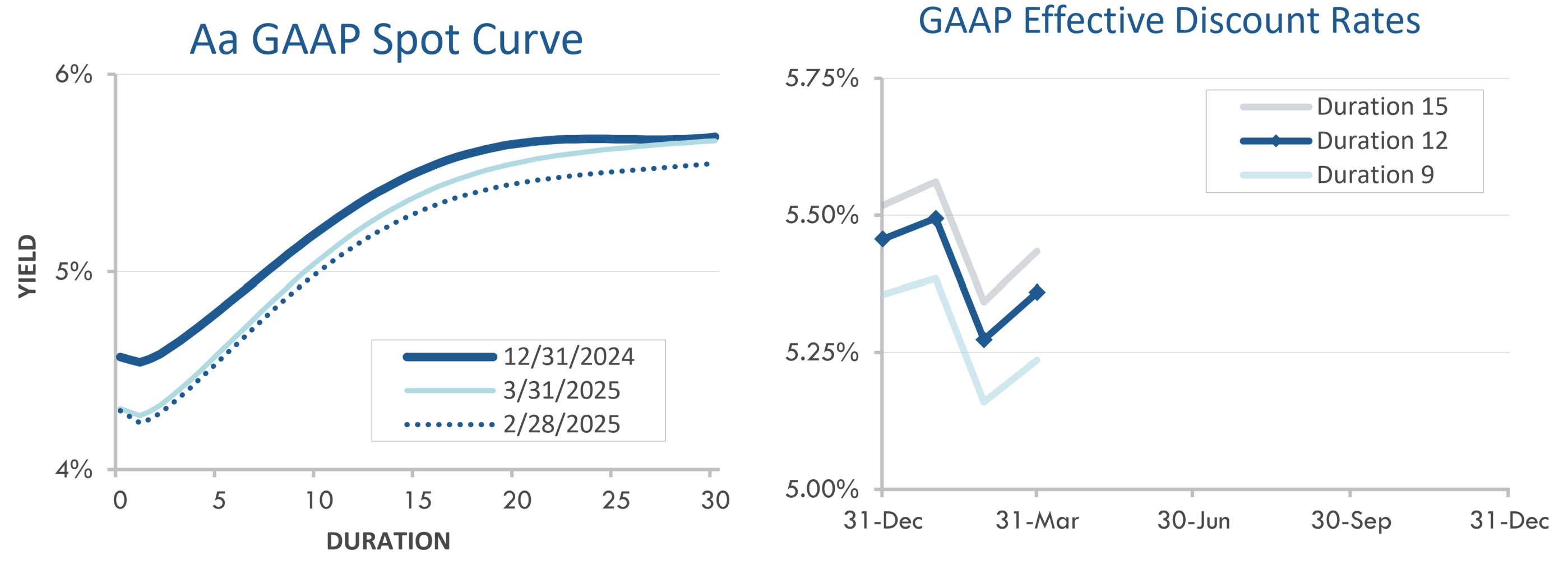 Pension liabilities (for funding, accounting, and de-risking purposes) are driven by market interest rates. The first graph below compares our Aa GAAP spot yield curve at December 31, 2024 and March 31, 2025 (along with the movement in the curve last month). The second graph below shows our estimate of movements in effective GAAP discount rates for pension obligations of various duration during 2025: