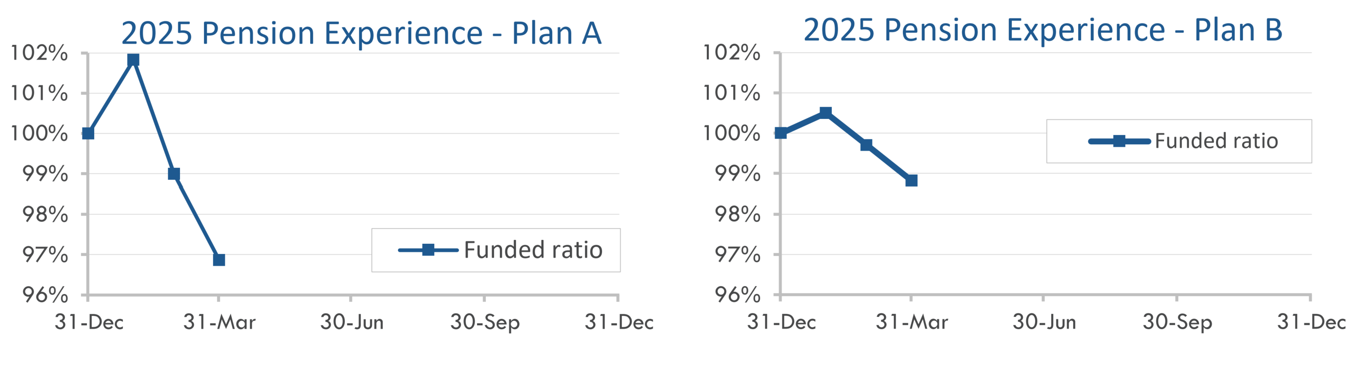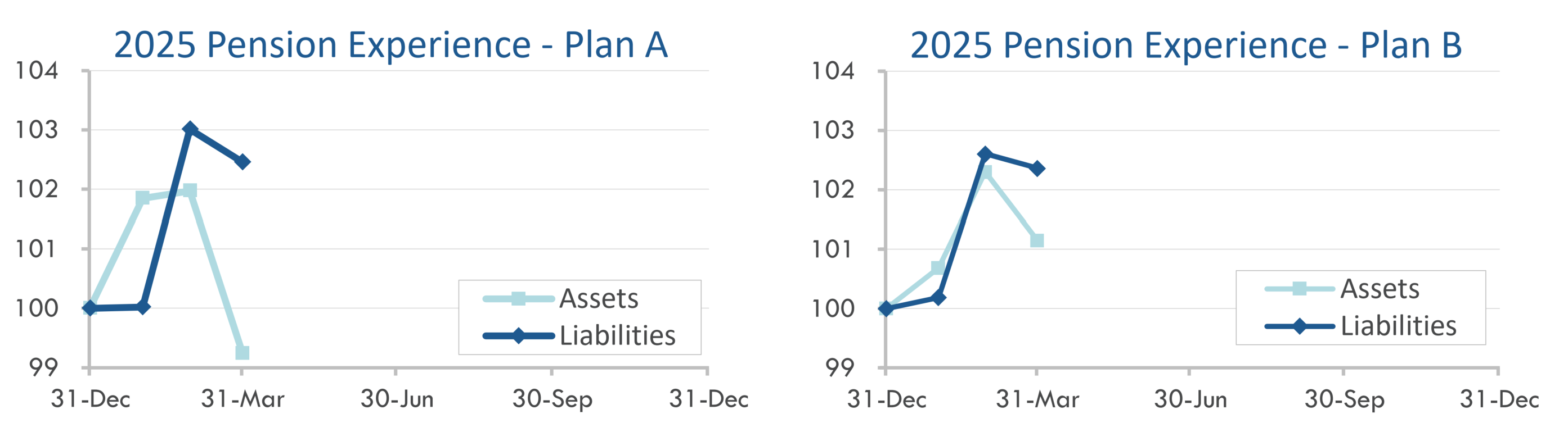 Pension sponsors suffered from lower US stock markets in the first quarter of the year. The graphs below show the movement of assets and liabilities during the first three months of 2025: