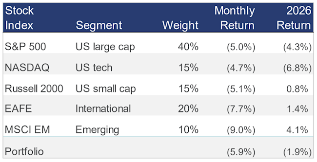 Overall, our traditional 60/40 portfolio lost 4% in March, ending the quarter down 1% for the year, while the conservative 20/80 portfolio lost 3% last month and is also down 1% through the first quarter of 2026.