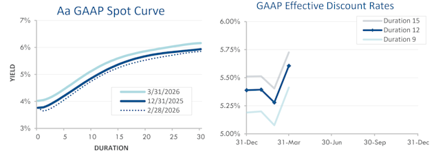 Pension liabilities (for funding, accounting, and de-risking purposes) are driven by market interest rates. The first graph below compares our Aa GAAP spot yield curve on December 31, 2025 and March, 31, 2026 (along with the movement in the curve last month). The second graph below shows our estimate of movements in effective GAAP discount rates for pension obligations of various duration during 2026: