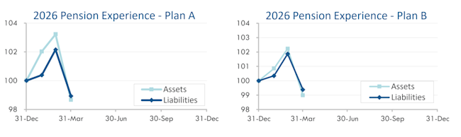 Lower stocks were partially offset by higher interest rates last month, producing a decline in funded status and pushing plans modestly underwater for the year through March. The graphs below show the movement of assets and liabilities during the first quarter of 2026: