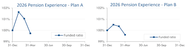 Pension finances lost ground in March due to declining stock markets, but higher interest rates softened the blow. Both model plans we track[1] lost 1% last month, and are now slightly underwater through the first quarter of 2026: