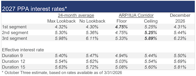 The table below summarizes rates that calendar-year plan sponsors are required to use for IRS funding purposes for 2026, along with estimates for 2027, including the rate “corridor” that applies to the 24-month average rates under funding relief for each segment.