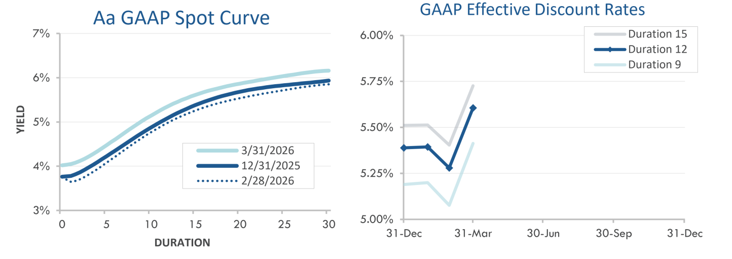 Pension liabilities (for funding, accounting, and de-risking purposes) are driven by market interest rates. The first graph below compares our Aa GAAP spot yield curve on December 31, 2025 and March, 31, 2026 (along with the movement in the curve last month). The second graph below shows our estimate of movements in effective GAAP discount rates for pension obligations of various duration during 2026: