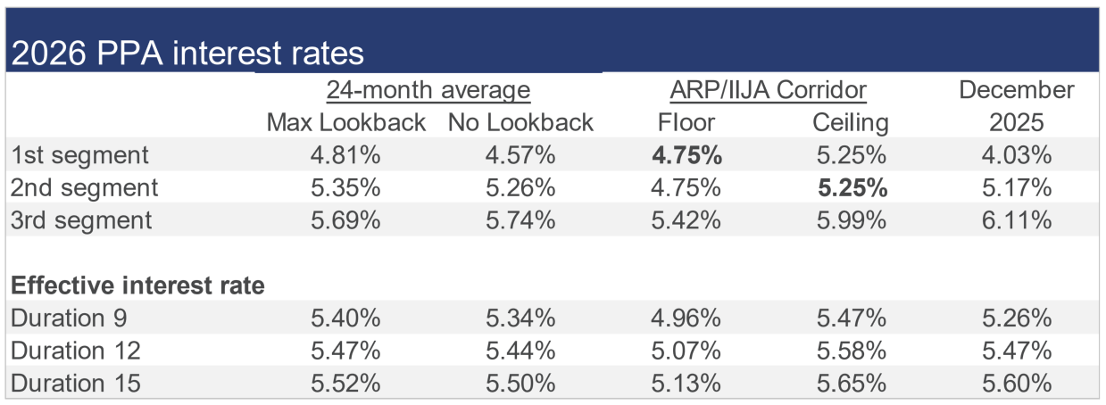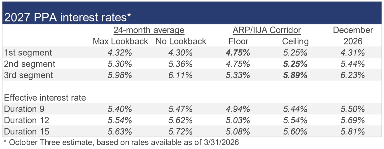 The table below summarizes rates that calendar-year plan sponsors are required to use for IRS funding purposes for 2026, along with estimates for 2027, including the rate “corridor” that applies to the 24-month average rates under funding relief for each segment.
