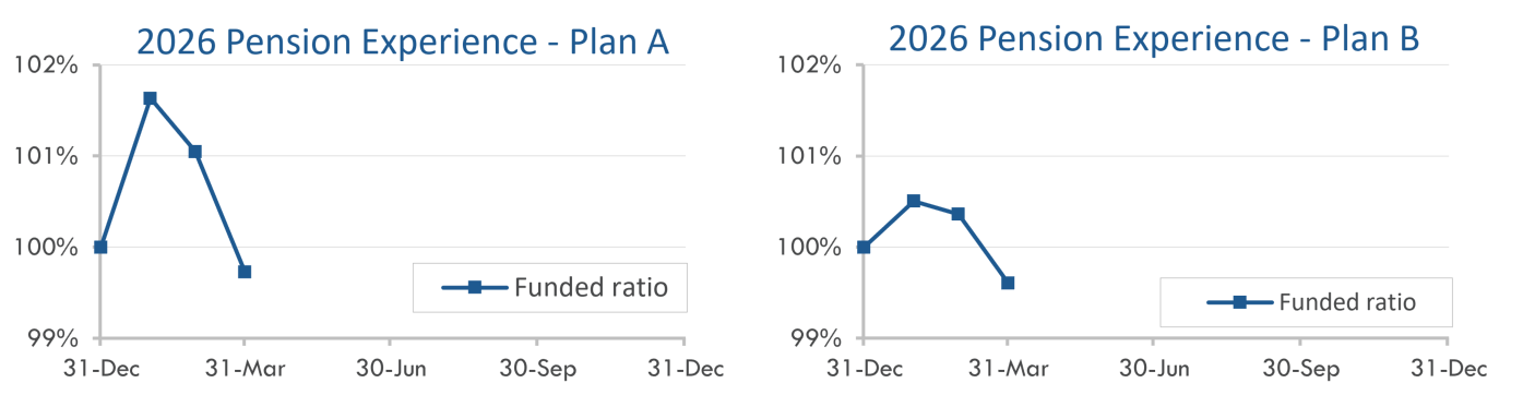 Pension finances lost ground in March due to declining stock markets, but higher interest rates softened the blow. Both model plans we track[1] lost 1% last month, and are now slightly underwater through the first quarter of 2026: